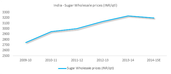 Domestic sugar prices is estimated to have grown at a CAGR of about 3.08% during 2009-15. Sugar pricing has seen a steady increasing behavior because it is regulated by government. As sugar is a sensitive consumer commodity, the movement of sugar pricing is done in a predetermined manner by monitoring domestic production and regulating import/export duties.